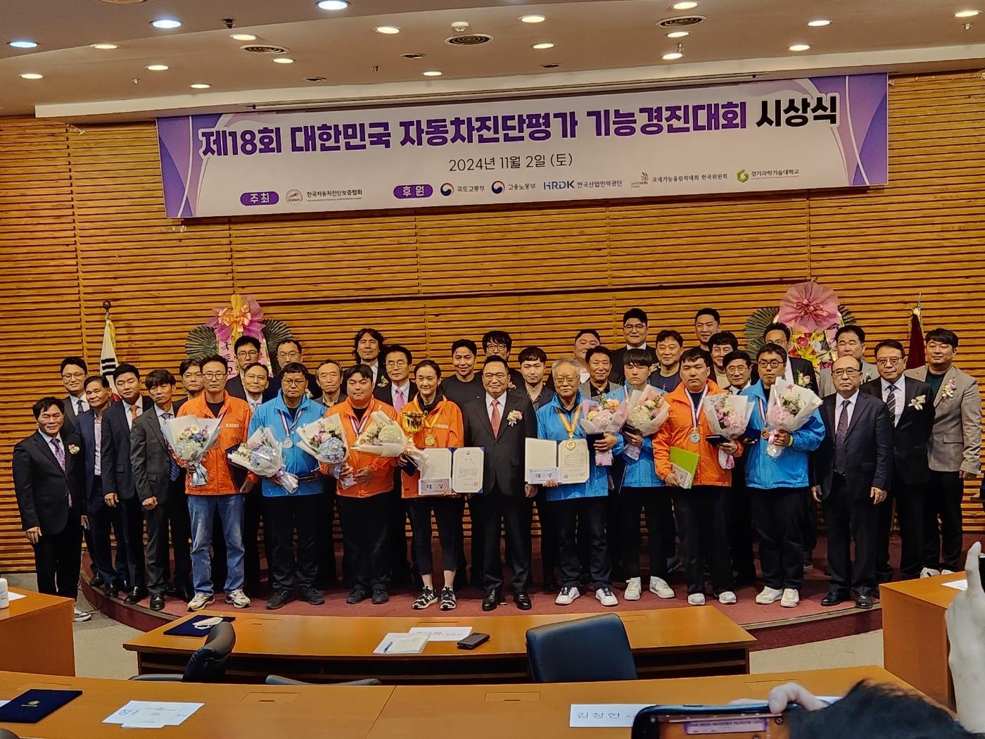 O. 우리대학(총장 김정수) 미래자동차과(학과장 봉필준)는 11월 2일(토) 경기과학기술대학교에서 개최된‘제 18회 대한민국 자동차진단평가 기능경진대회’에서 대상을 비롯한 금상, 은상 및 동상을 수상하는 영애를 안았다. 경진대회의 수상자는 다음과 같다. 일반부 부분 대상(국토교통부 장관상)에 2학년 김O영, 금상(국제기능올림픽한국원회 회장상)에 3학년 김O욱, 학생부 부분 은상(경기과학기술대학교 총장상)에 4학년 조O선, 동상(한국자동차진단보증협회 회장상)에 4학년 심O보 학생이 수상을 하였다. 또한 자동차진단평가 발전에 기여하고, 우수한 수상자들을 배출한 공로를 인정받아 단체상(한국자동차진단보증협회장상)과 우수지도자 표창장(국회의원상 – 봉필준교수, 송락현교수)을 수상하는 쾌거를 이루었다.