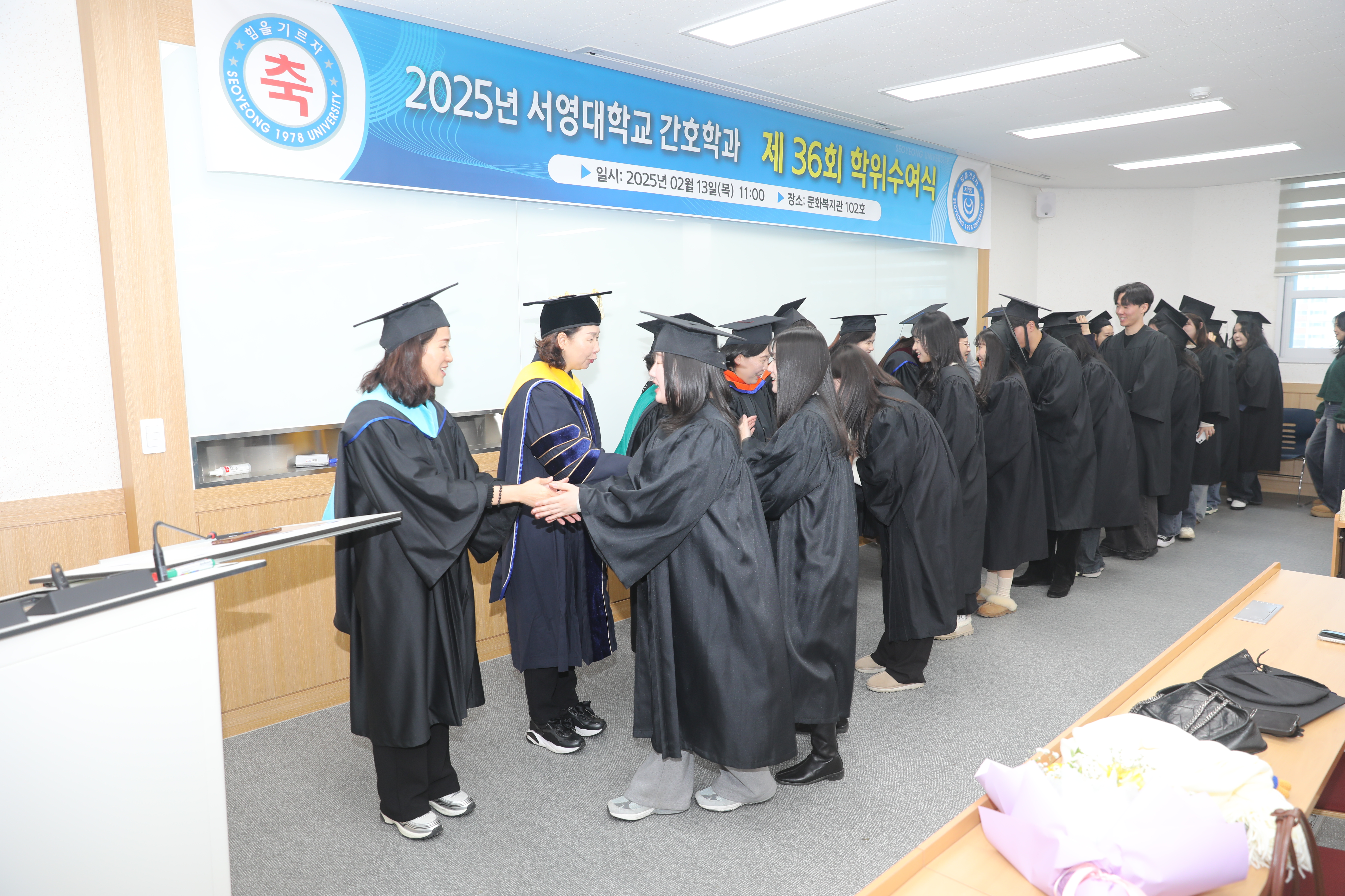 ○ 간호학과 졸업생들은 돌아가면서 교수들과 악수하며 그동안 배움에 대해 감사함을 전하기도 했다.